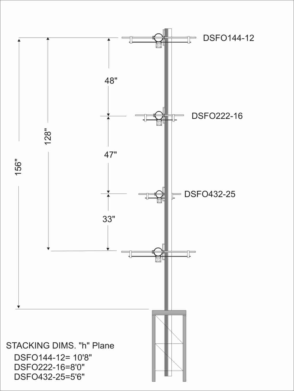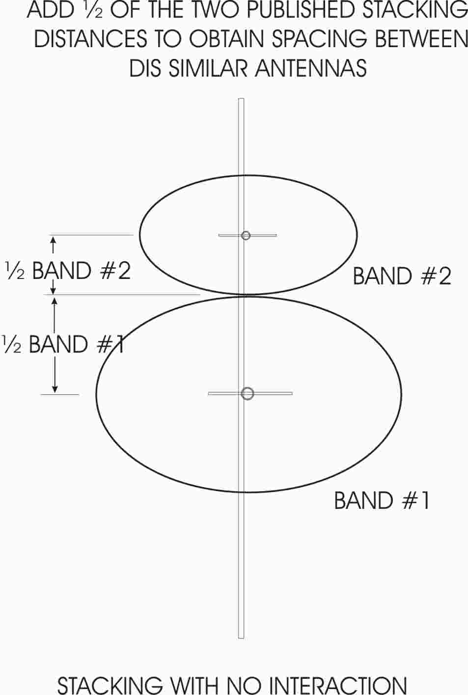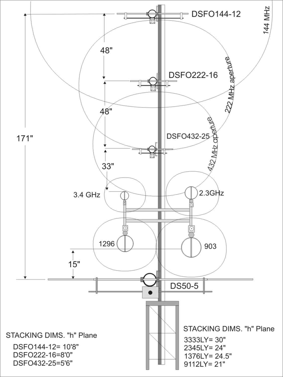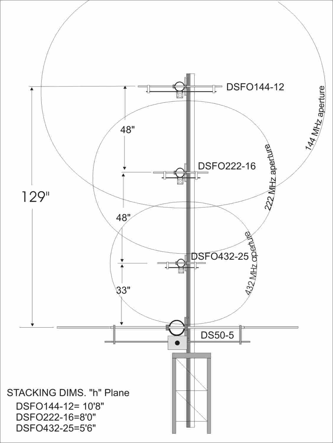 So how do you arrive at a proper spacing number for different bands? If you are stacking two antennas on different bands, you must look at the stacking distance for each antenna and locate the antennas so neither aperture sees the other antenna aperture. Let's take an example. We wish to stack a DSFO144-12 along with a DS222-10RS on the same mast. The 144-12 stacking distance (h-plane) is 10 ft 8" while the DS222-10RS is 74" . Take half of the stacking distance for the lowest frequency antenna and you have the extent of the aperture boundary for that antenna. In this case it is 5 ft 4 inches, or 64". Do the same for the other antenna. The correct distance for zero interaction, then, is 64 plus 37 inches, or 101" total spacing. Simple enough. There is no way either antenna will be bothered by the other PERIOD!