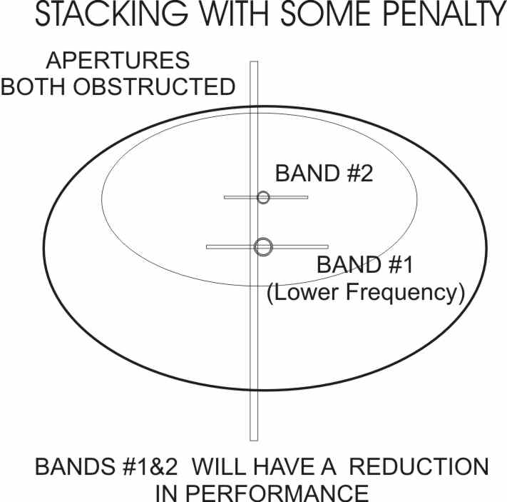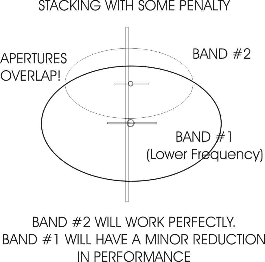 Most people would quickly run out of room with this method, however, so we can fudge the numbers slightly. If you place the smaller antenna so that it's aperture just approaches the physical location of the lower frequency antenna, you have accomplished almost the same thing. True, there is some slight interaction, as seen below.