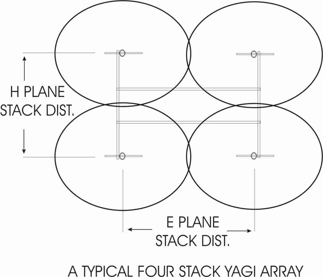 We try to provide suitable stacking distances for all of our antennas. This information is always printed on the specification sheet for the individual antenna. For horizontally polarized antennas, the vertical stacking distance is referred to as the h-plane or magnetic field plane. The e plane or electric field extends out along the axis of the elements. In the case of horizontally polarized yagis, this would be the side to side stacking dimension as shown above. Loop yagis are slightly different in that you have no linear rod elements, but the same rules apply. You can see from the figures, that the stacking distance is exactly the diameter of the aperture. One half of the stacking distance is the apparent radius of the aperture. Note also that, for yagis, the e plane aperture is slightly wider than the h plane dimension.