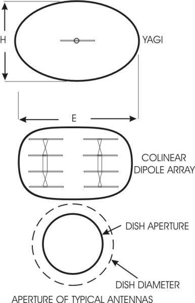 First we need to understand a few things about antennas. Every antenna has a collecting area to snag errant electromagnetic waves. It is no accident that signal strengths are measured in microvolts per meter. The truth is that a larger antenna can intercept more energy by simply occupying more physical area. Sounds simple enough! This is also the reason that apparent path loss goes up with frequency. At higher frequencies, the antenna is smaller and cannot collect the same amount of energy that it's lower frequency sister antenna does. The collecting area of any antenna is called its aperture. Generally, the aperture of most amateur VHF directional antennas is larger than the physical frontal outline. Yagis have a much larger aperture. Arrays of half waves, such as collinears, have smaller apertures extending just beyond the physical structure, while parabolic antennas have apertures that are slightly smaller than the physical size of the dish.