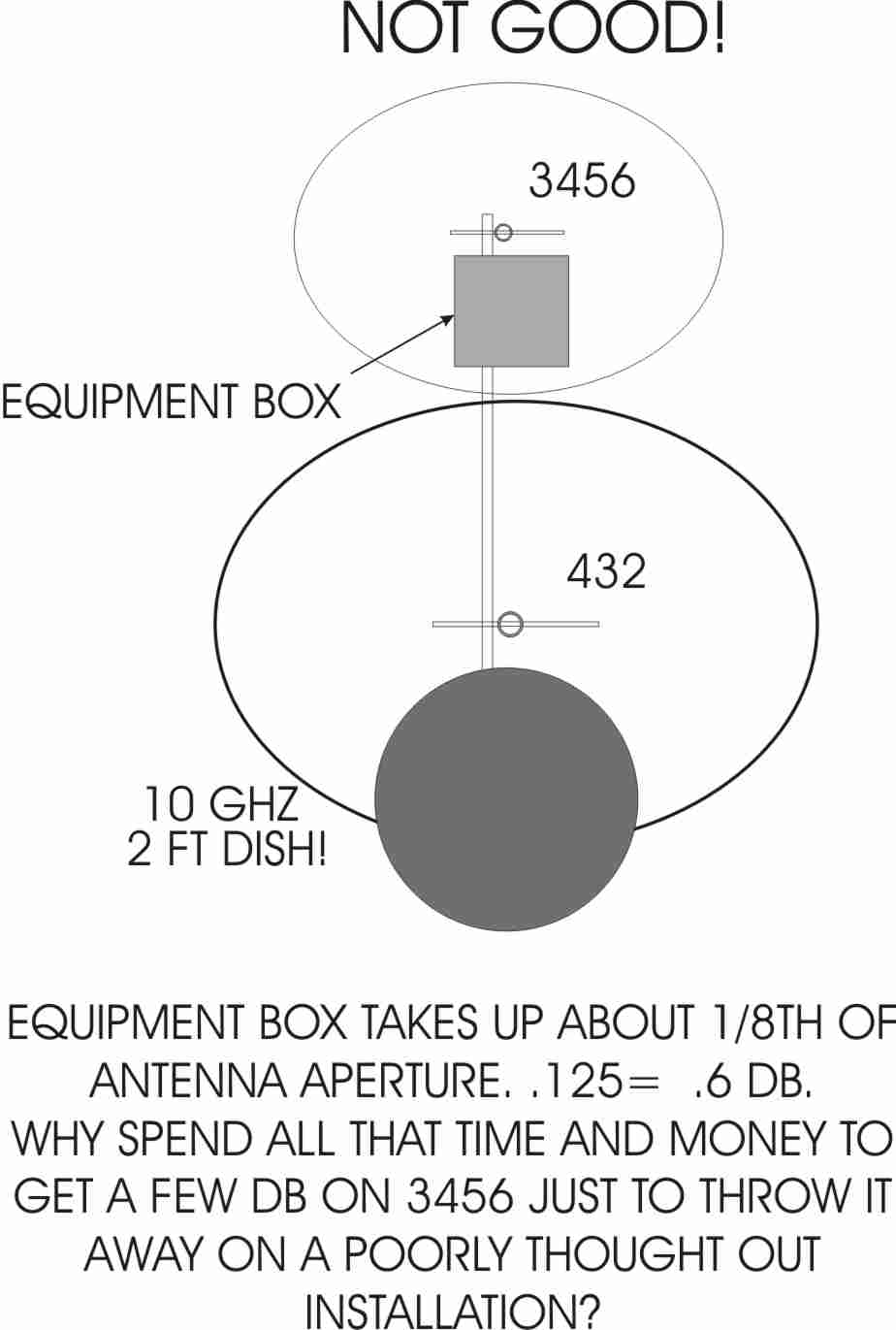 So what else should we avoid? Those darn parabolic dishes can be a pain. Unlike other yagis, which produce minimal blockage, dishes all appear as large solid lumps of metal to lower frequency antennas. A three ft or four ft dish is a huge area to block off. You could easily lose a few dB on a UHF frequency if such a dish was mounted next to a UHF yagi. Of course, the dish would function normally. Look back at FIGURE 1 for the reason! The same can be said for metal boxes and weatherproof housings such as ones that may contain microwave transverters or power amplifiers. Any metal box that is within the aperture of a microwave loop yagi will cause problems. As an example, I tried to mount a 3456 transverter with an associated 45 watt amplifier up close to my 3456 MHz loop yagi. I actually measured the effects of the box on an antenna range. As soon as the box started to enter the aperture area of the 9112LY (112 element loop yagi) I could see the gain go down. I ended up mounting the box sideways to reduce the footprint, and dropped it 14" below the loop yagi. Any closer, and I could start to see some gain drop off. I saw more than 1/2 dB of reduction with the box fully inside the aperture area. This drop in gain tracks with my mechanical calculations of blockage for the metal box as well. You struggle so hard to get gain at those frequencies. Feed line loss is high. Coax relays are lossy. Power is so hard to generate. So why squander your hard earned antenna gain with a poorly located metal box? You worked hard to get that gain. Why throw it away? The point to remember is the relative size of your obstruction vs. the calculated area of the antenna aperture. At 3456 MHz, the aperture is getting smaller, while the big metal boxes are getting bigger! I just don't put a preamp up there, I want the preamp, the transverter, and the 45 watt power amplifier up there to boot!