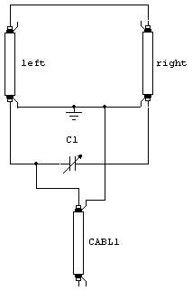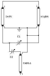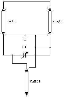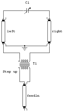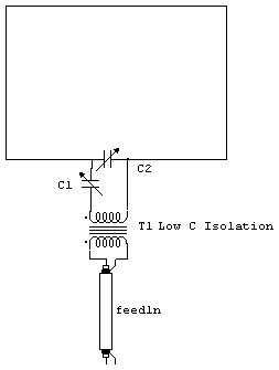 Above, feedpoint with adjustable matching. Impedances shunting C left and right are both low, but impedance balance is slightly flawed.