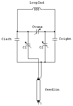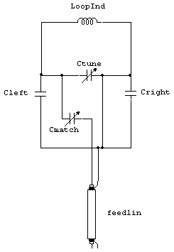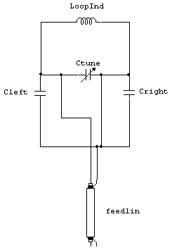 Shown above left, unbalanced stray capacitance excitation of the inner conductor. Note the lack of a clear return path for the inner wire current to the feedline. The differential current path exciting the inner conductor is actually through the stray capacitance of the right cable only, although both sides can affect SWR. This has the potential to unbalance the loop shield currents and cause energy transfer problems. The feed system SWR is critically dependent on loop coaxial length and loop coaxial impedance (distributed capacitance). Above right, electrical equivalent. This system depends on cable capacitance to form a voltage divider that excites the inner conductor and matches the loop impedance to the feedline impedance. C right has a very high impedance compared to C left, since C right is shunted by the very low feedline impedance.