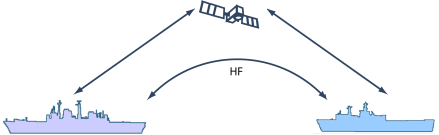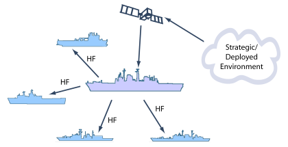 Messages are then relayed onwards to the other ships in the task force, often using the same communications technology as in ship to shore. The above scenario shows use of Satellite to reach the command ship and broadcast HF (high frequency) radio for communication with the other units in the task force. Multicast can be used for communication from the command ship to the other ships. In EMCON, messages can be received from shore or from other vessels, but not transmitted between ships or back to shore. More complex situations may arise with individual vessels in EMCON.