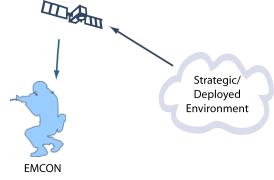 - One channel in EMCON. Typically Satellite channel will be in EMCON, because it has a stronger signal and is more visible. However, the "pencil beam" nature of the satellite and location of threat may lead to HF channel in EMCON and satellite active.