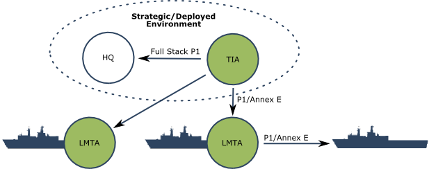 - TIA (Tactical Interface Agent). This is an MTA which makes use of P1/Annex E to communicate with LMTAs (or other TIAs). It will also communicate with "full stack" P1 to other MTAs, to enable LMTAs to be interconnected to a general X.400 network.