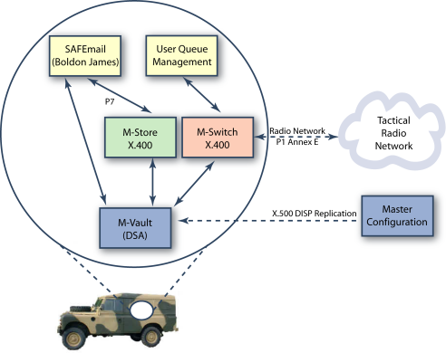 The above diagram shows the structure of a single user system. The core of this system is M-Switch X.400 acting as an LMTA, with SAFEMail.mil connected via M-Store X.400. All of this operates on a single box.