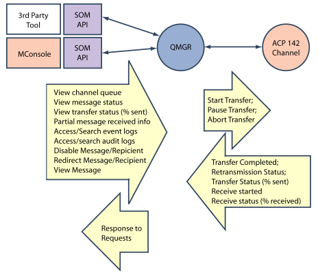 The ACP 142 channel will gather incoming packets, and report transfer status to the QMGR. When a complete message is received, it will be submitted into the M-Switch queue. When a message is to be routed over ACP 142, the QMGR will instruct the ACP 142 channel to process the message, which will be in the MTA queue. The ACP 142 channel will then pre-compute the data packets and send the message. The ACP 142 channel will inform QMGR of transfer status, and update information in the MTA queue when needed.