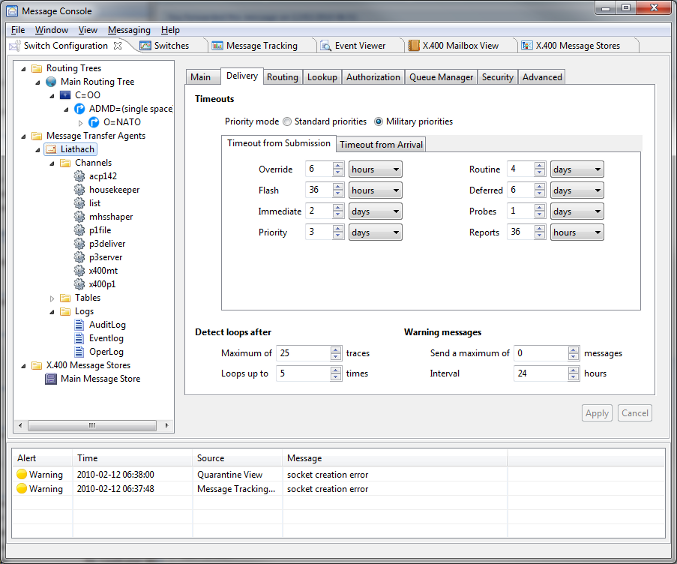 Isode provides GUI management of M-Switch X.400 using its MConsole product. This includes configuration of Annex E and ACP 142 configuration. The screenshot below shows an X.400 MTA, set up for military use (STANAG 4406).