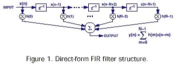 Skolnick USING DIGITAL FILTERS Many of the architectural features of the DSP, such as the ability to perform zero-overhead loops, and to fetch two data values in a single processor cycle, will be useful in implementing this filter. Reviewing briefly, an FIR filter is an all-zeros filter that is calculated by convolving an input data-point series with filter coefficients. Its governing equation and direct-form representation are shown in Figure 1.