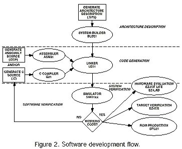 ![]() In this structure, each "z–1 " box represents a single increment of history of the input data in z-transform notation. Each of the successively delayed samples is multiplied by the appropriate coefficient value, h(m), and the results, added together, generate a single value representing the output corresponding to the nth input sample. The number of delay elements, or filter taps, and their coefficient values, determine the filter’s performance. The filter structure suggests the physical elements needed to implement this algorithm by computation using a DSP. For the computation itself, each output sample requires a number of multiply-accumulate operations equal to the length of the filter. The delay line for input data and the coefficient value list require reserved areas of memory in the DSP for storing data values and coefficients. The DSP’s enhanced Harvard architecture lets programmers store data in Program Memory as well as in Data Memory, and thus perform two simultaneous memory accesses in every cycle from the DSP’s internal SRAM. With Data Memory holding the incoming samples, and Program Memory storing the coefficient values, both a data value and a coefficient value can be fetched in a single cycle for computation. This DSP architecture favors programs that use circular buffering (discussed briefly in Part 2 and later in this installment). The implication is that address pointers need to be initialized only at the beginning of the program, and the circular buffering mechanism ensures that the pointer does not leave the bounds of its assigned memory buffer—a capability used extensively in the FIR filter code for both input delay line and coefficients. Once the elements of the program have been determined, the next step is to develop the DSP source code to implement the algorithm. DEVELOPING DSP SOFTWARE Software development flow for the ADSP-2100 Family consists of the following steps: architecture description, source-code generation, software validation (debugging), and hardware implementation. Figure 2 shows a typical development cycle.