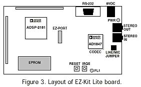 ![]() Architecture description: First, the user creates a software description of the hardware system on which the algorithm runs. The system description file includes all available memory in the system and any memory-mapped external peripherals. Below is an example of this process using the ADSP-2181 EZ-Kit Lite. Source-code generation: Moving from theory into practice, this step—where an algorithmic idea is turned into code that runs on the DSP—is often the most time-consuming step in the process. There are several ways to generate source code. Some programmers prefer to code their algorithms in a high-level language such as C; others prefer to use the processor’s native assembly language. Implementations in C may be faster for the programmer to develop, but compiled DSP code lacks efficiency by not taking full advantage of a processor’s architecture. Assembly code, by taking full advantage of a processor’s design, yields highly efficient implementations. But the programmer needs to become familiar with the processor’s native assembly language. Most effective is combining C for high-level program-control functions and assembly code for the time-critical, math-intensive portions of the system. In any case, the programmer must be aware of the processor’s system constraints and peripheral specifics. The FIR filter system example in this article uses the native assembly language of the ADSP-2100 Family. Software validation ("debugging"): This phase tests the results of code generation—using a software tool known as a simulator— to check the logical flow of the program and verify that an algorithm is performing as intended. The simulator is a model of the DSP processor that a) provides visibility into all memory locations and processor registers, b) allows the user to run the DSP code either continuously or one instruction at a time, and c) can simulate external devices feeding data to the processor. Hardware implementation: Here the code is run on a real DSP, typically in several phases: a) tryout on an evaluation platform such as EZ-Kit Lite; b) in-circuit emulation, and c) production ROM generation. Tryout provides a quick go/no-go determination of the program’s operation; this technique is the implementation method used in this article. In-circuit emulation monitors software debug in the system, where a tool such as an EZ-ICE™ controls processor operation on the target platform. After all debug is complete, a boot ROM of the final code can be generated; it serves as the final production implementation. WORKING WITH THE ADSP-2181 EZ-KIT LITE Our example of the development cycle walks through the process, using the ADSP-2181 EZ-Kit Lite (development package ADDS-21xx- EZLITE) as the target hardware for the filter algorithm. The EZ-Kit Lite, a low-cost demonstration and development platform, consists of a 33-MHz ADSP-2181 processor, an AD1847 stereo audio codec, and a socketed EPROM, which contains monitor code for downloading new algorithms to the DSP through an RS-232 connection (Figure 3).