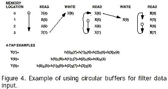 The listing declares 16,384 locations of PM as RAM, starting at address 0, to let both code segments and data values be placed there. Also declared are 16,352 available locations of data memory as RAM, starting at address 0. Because these processors use a Harvard architecture with two distinct memory spaces, PM address 0 is distinct from DM address 0. The ADSP-2181 EZ-Kit Lite’s codec is connected to the DSP using a serial port, which is not declared in the system description file. To make the system description file available to other software tools, the System Builder utility, BLD21, converts the .SYS file into an architecture, or .ACH, file. The output of the System Builder is a file named EZKIT_LT.ACH. After writing the code, the next step is to generate an executable file, i.e., turn the code into instructions that the DSP can execute. First one assembles the DSP code. This converts the program file into a format that the other development tools can process. Assembling also checks the code for syntax errors. Next, one links the code to generate the DSP executable, using the available memory that is declared in the architecture file. The Linker fits all of the code and data from the source code into the memory space; the output is a DSP executable file, which can be downloaded to the EZ-Kit Lite board. GENERATING FILTER CODE Part 2 of this series [Analog Dialogue 31-2, page 14, Figure 6] introduced a small assembly code listing for an FIR filter. Here, that code is augmented to incorporate some EZ-Kit Lite-specific features, specifically codec initialization and data I/O. The core filter-algorithm elements (multiply-accumulates, data addressing using circular buffers for both data and coefficients, and reliance on the efficiency of the zero-overhead loop) do not change. The incoming data will be sampled using the on-board AD1847 codec, which has programmable sampling rate, input gain, output attenuation, input selection, and input mixing. Its programmable nature makes the system flexible, but it also adds a task of programming to initialize it for the DSP system. ACCESSING DATA For this example, a series of control words to the codec—to be defined at the beginning of the program in the first section of the listing—will initialize it for an 8-kHz sampling rate, with moderate gain values on each of the input channels. Since the AD1847 is programmable, users would typically reuse interface and initialization code segments, changing only the specific register values for different applications. This example will add the specific filter segment to an existing code segment found in the EZ-Kit Lite software. This interface code declares two areas in memory to be used for data I/O: "tx_buf", for data to be transmitted out of the codec, and "rx_buf", where incoming data is received. Each of these memory areas, or buffers, contains three elements, a control or status word, left-channel data, and right-channel data. For each sample period, the DSP will receive from the codec a status word, left channel data, and right channel data. On every sample period, the DSP must supply to the codec a transmit control word, left channel data, and right channel data. In this application, the control information sent to the codec will not be altered, so the first word in the transmit data buffer will be left as is. We will assume that the source is a monophonic microphone, using the right channel (no concern about left-channel input data). Using the I/O shell program found in the EZ-Kit Lite software, we need only be involved with the section of code labeled "input_samples". This section of code is accessed when new data is received from the codec ready to be processed. If only the right channel data is required, we need to read the data located in data memory at location rx_buf + 2, and place it in a data register to be fed into the filter program. The data arriving from the codec needs to be fed into the filter algorithm via the input delay line, using the circular buffering capability of the ADSP-2181. The length of the input delay line is determined by the number of coefficients used for the filter. Because the data buffer is circular, the oldest data value in the buffer will be wherever the pointer is pointing after the last filter access (Figure 4) . Likewise the coefficients, always accessed in the same order every time through the filter, are placed in a circular buffer in Program Memory.