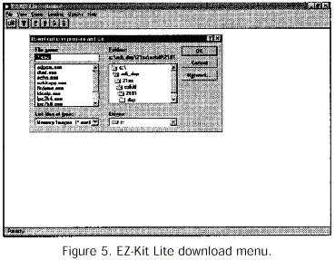 ![]() Algorithm Code The ADSP-2181’s MAC stores the result in a 40-bit register (32 bits for the product of 2 16-bit words, and 8 bits to allow the sum to expand without overflowing). This allows intermediate filter values to grow and shrink as necessary without corrupting data. The code segment being used is generic (i.e., can be used for any length filters); so the MAC’s extra output bits allow arbitrary filters with unknown data to be run with little fear of losing data. To implement the FIR filter, the multiply/accumulate operation is repeated for all taps of the filter on each data point. To do this (and be ready for the next data point), the MAC instruction is written in the form of a loop. The ADSP-21xx’s zero-overhead loop capability allows the MAC instruction to be repeated for a specified number of counts without programming intervention. A counter is set to the number of taps minus one, and the loop mechanism automatically decrements the counter for each loop operation. Setting the loop counter to "taps–1" ensures that the data pointers end up in the correct location after execution is finished and allows the final MAC operation to include rounding. As the AD1847 is a 16-bit codec, the MAC with rounding provides a statistically unbiased result rounded to the nearest 16-bit value. This final result is written to the codec. For optimal code execution, every instruction cycle should perform a meaningful mathematical calculation. The ADSP-21xxs accomplish this with multi-function instructions: the processor can perform several functions in the same instruction cycle. For the FIR filter code, each multiply-accumulate (MAC) operation can be performed in parallel with two data accesses, one from Data Memory, one from Program Memory. This capability means that on every loop iteration a MAC operation is being performed. At the same time, the next data value and coefficient are being fetched, and the counter is automatically decremented. All without wasting time maintaining loops. As the filter code is executed for each input data sample, the output of the MAC loop will be written to the output data buffer, tx_buf. Although this program only deals with single-channel input data, the result will be written out to both channels by writing to memory buffer addresses tx_buf+1 and tx_buf+2. The final source code listing is shown on page 15. The filter algorithm itself is listed under "Interrupt service routines". The rest of the code is used for codec and DSP initialization and interrupt service routine definition. Those topics will be explored in future installments of this series. THE EZ-KIT LITE The Windows-based monitor software provided with the EZ-Kit Lite, makes it possible to load an executable file into the ADSP-2181 on the EZ-Kit Lite board. This is accomplished through the pull-down "Loading" menu by selecting "Download user program and Go" (Figure 5). This will download the filter program to the ADSP-2181 and start program execution.